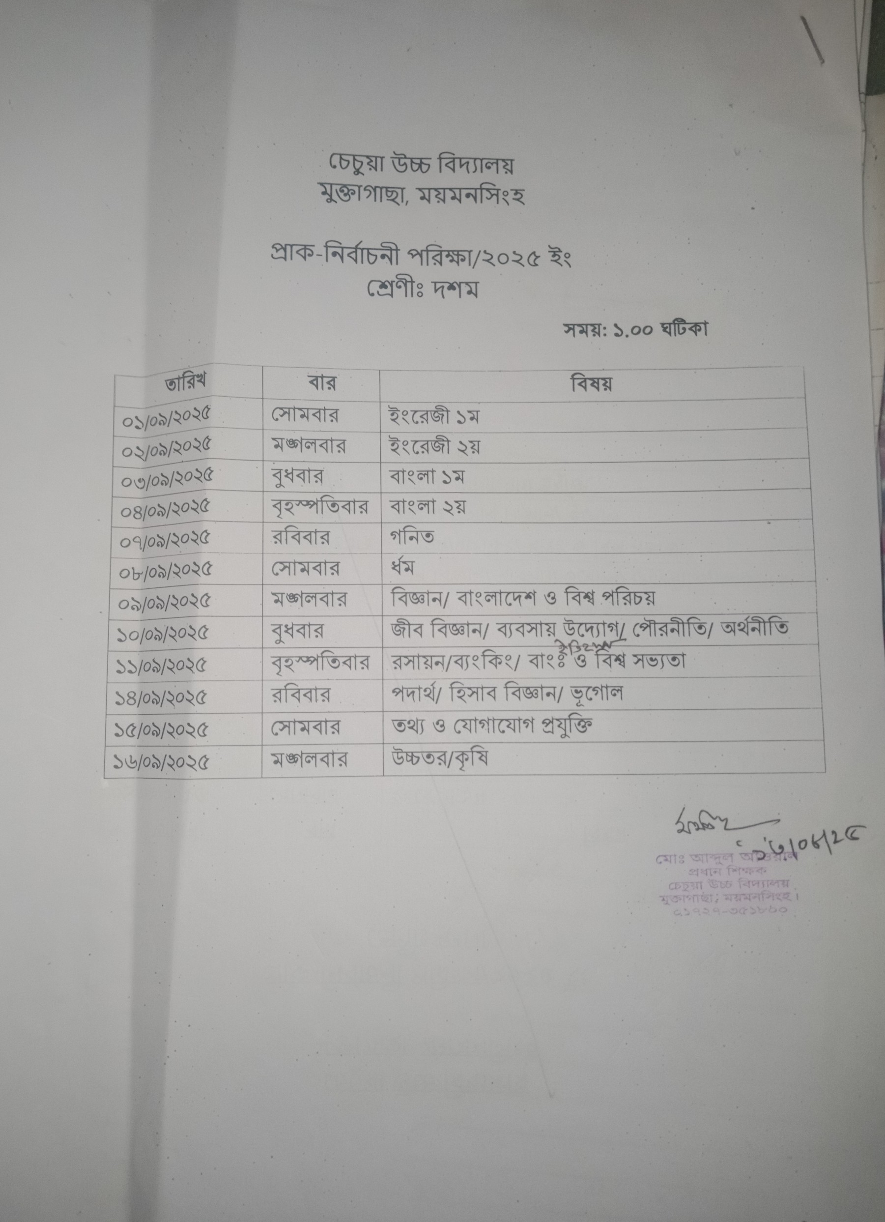 এত দ্বারা ১০ম শ্রেনির সকল শিক্ষার্থীদের অবগতির জন্য জানানো যাচ্ছে যে, আগামি ০১-০৯-২০২৫ ইং তারিখ হইতে প্রাক - নির্বাচনি পরিক্ষা অনুষ্ঠিত হইবে। উক্ত পরিক্ষার ফি ও সকল পাওনাদি পরিশোধ করে প্রবেশ পত্র গ্রহণ করার জন্য বলা হইলো।
